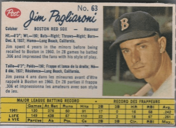 Thanks to the wonderful SABR-written bio of Pagliaroni, I can tell you that two years later, Pagliaroni would get some coaching from Dave Sisler’s father, a Hall of Famer. I can also tell you that Pagliaroni sounds like a pretty good guy. He worked closely with the MLBPA as a player rep, raised money for the Baseball Assistance Team and MLBPA Alumni Association, as well as the ALS Association, where his connection was being the catcher for Catfish Hunter’s perfect game. He was also a partner in a renewable energy project development company.