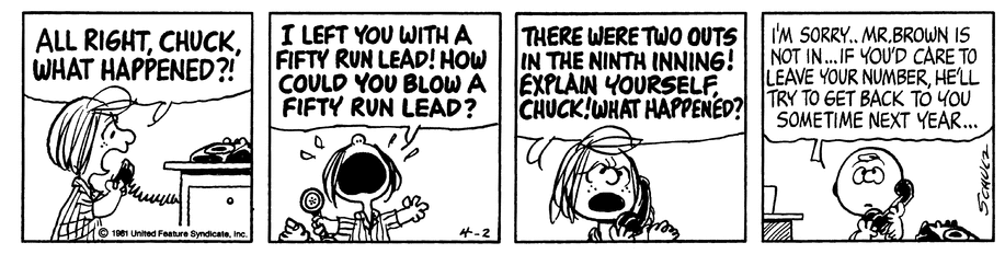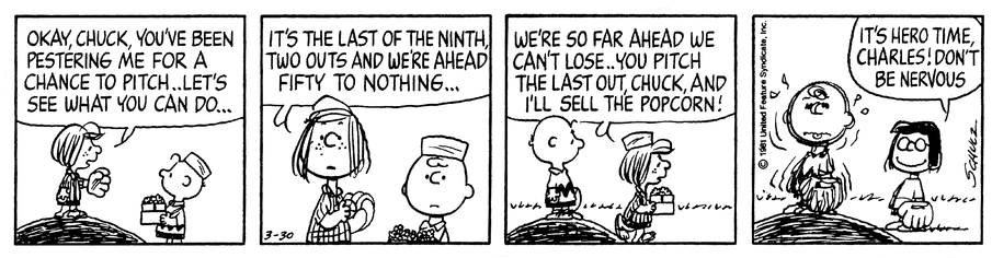From March 23 to April 3, 1981, Schulz told the story of a baseball game – one between a team run by Peppermint Patty and an unnamed opponent. Patty convinced Charlie Brown to come to the game and sell popcorn. Charlie Brown really wanted to pitch.