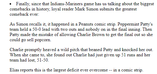 Sure enough, Jayson was sharing my tidbit with the world a couple days later on ESPN.com (it’s still there!), giving me props for making the association, and making the joke that the Elias Sport Bureau confirmed it to be the greatest baseball comeback in a comic strip.